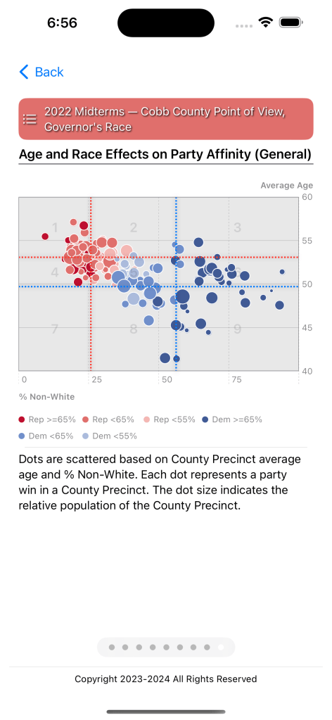 The importance of considering this interaction becomes abundantly clear when you compare measures of party affinity across contests. In the graphic below I compare the party affinity computed in Cobb County for both the US Senate and Governor’s contest. The graphic on the left (the US Senate Contest) shows a noticeably weaker affinity for the Republican Party than the graphic on the right (the Governor’s Contest). While incumbency plays a role, significant differences in affinity suggest the substantial influence of individual candidates and their narratives on electoral outcomes.