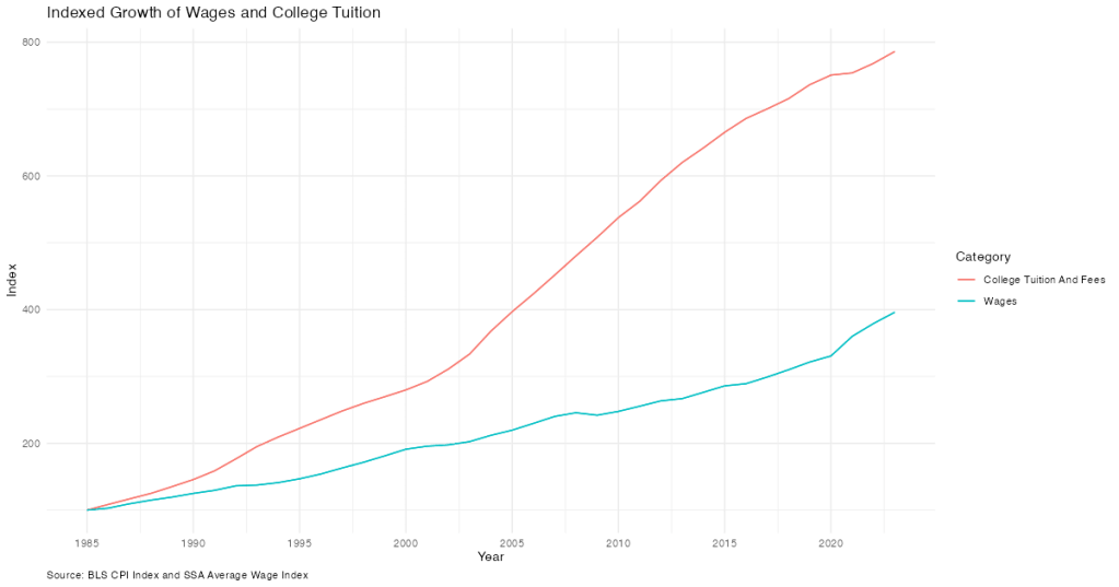 The chart below illustrates this clearly: while wages have grown steadily, college tuition and fees have skyrocketed, nearly doubling the rate of wage growth since the mid-1980s.
