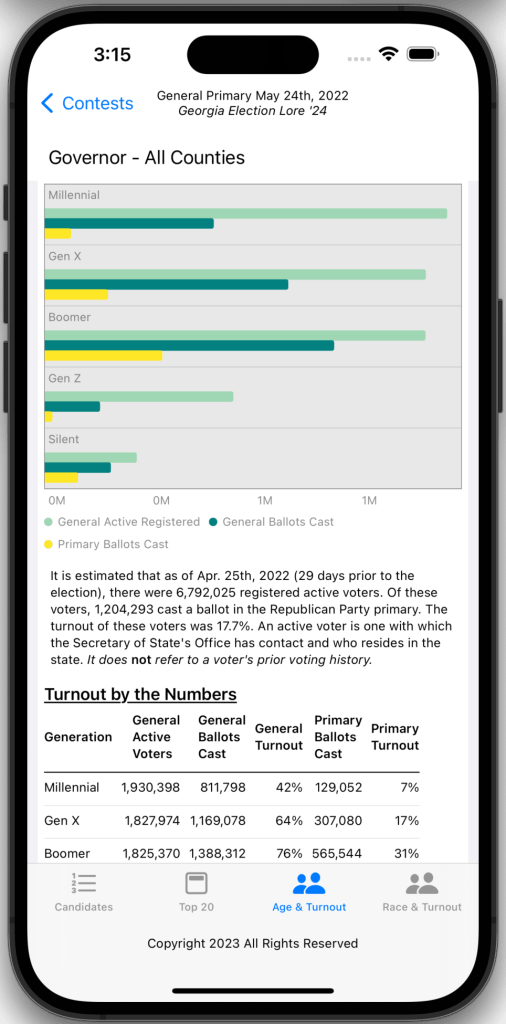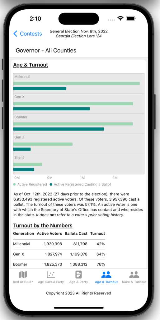 And yet they don’t vote so much, as illustrated in the screenshot in Figure 1. The screenshot is taken from the Georgia Election Lore ’24 app. What it shows is that millennials make up the largest voting block in statewide contests in the 2022 general election, but they are out voted by both Boomers and Gen X.