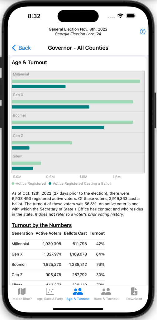 The voter segments are displayed in descending order; the segment with largest population is displayed first. The light green bar represents the number of registered voters in that segment. The dark green bar represents the number of voters that cast a ballot in that segment in the general election. The view concludes with detailed counts for each segment.