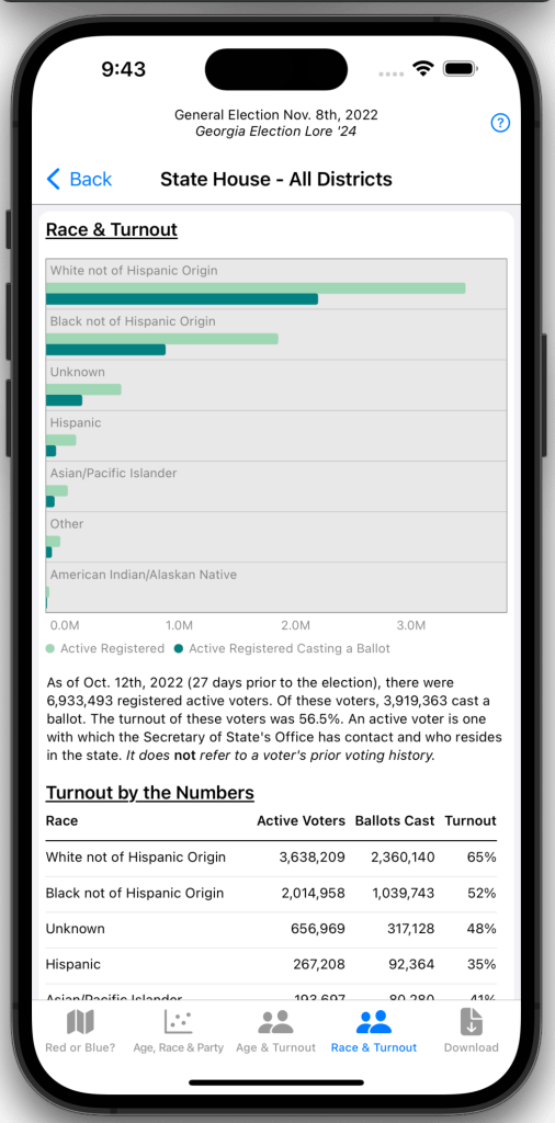 The race categories are displayed in descending order; the category with largest population is displayed first. The light green bar represents the number of registered voters in that category. The dark green bar represents the number of voters in that category that cast a ballot in the general election. The view concludes with detailed counts for each category.