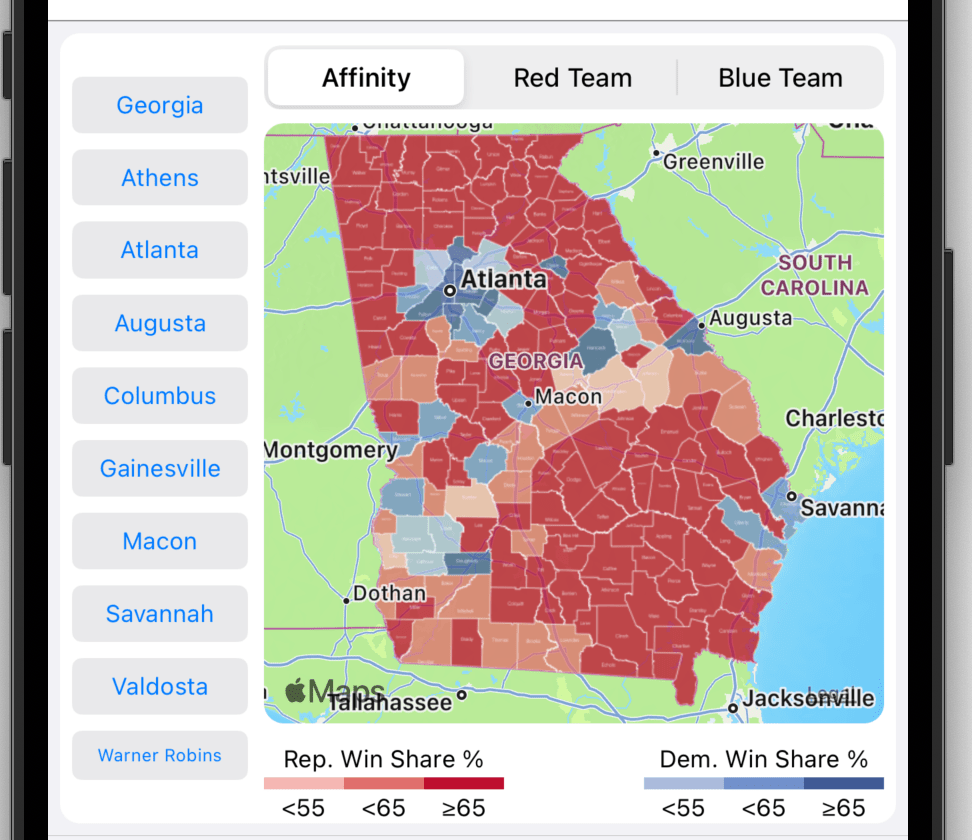 County Map: County maps are used in statewide contests. They show at a county level which party carried a county (Affinity) or which county amassed the most votes for a party (Red or Blue Team). Tap the county to view county specific details.