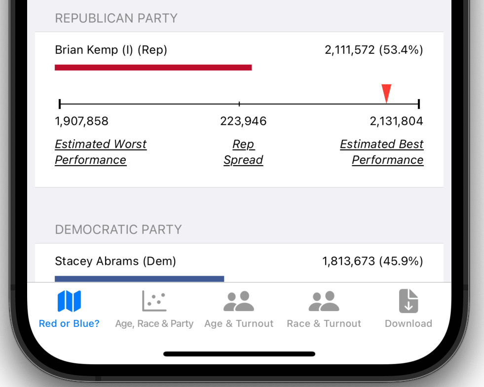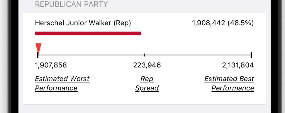 The vote spread depicts how well a given candidate performed in comparison to other candidates of the same party. The essential point in this comparison is some voters split their tickets. What that means is that given some set of votes two candidates in the same party get a different number of votes. For example, Walker in the US Senate contest received more than 200,000 fewer votes than Kemp in the governor’s race. The vast majority of that 200,000 vote difference went to Senator Warnock. Some of them when to Oliver (Libertarian). And the rest ended up as undervotes. Using vote counts at the precinct level, one can estimate the likely best and worst party performance. This spread represents the swing vote. It also suggests that some candidates could have done better whereas in some contests different candidates could have done better.
