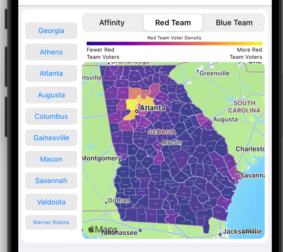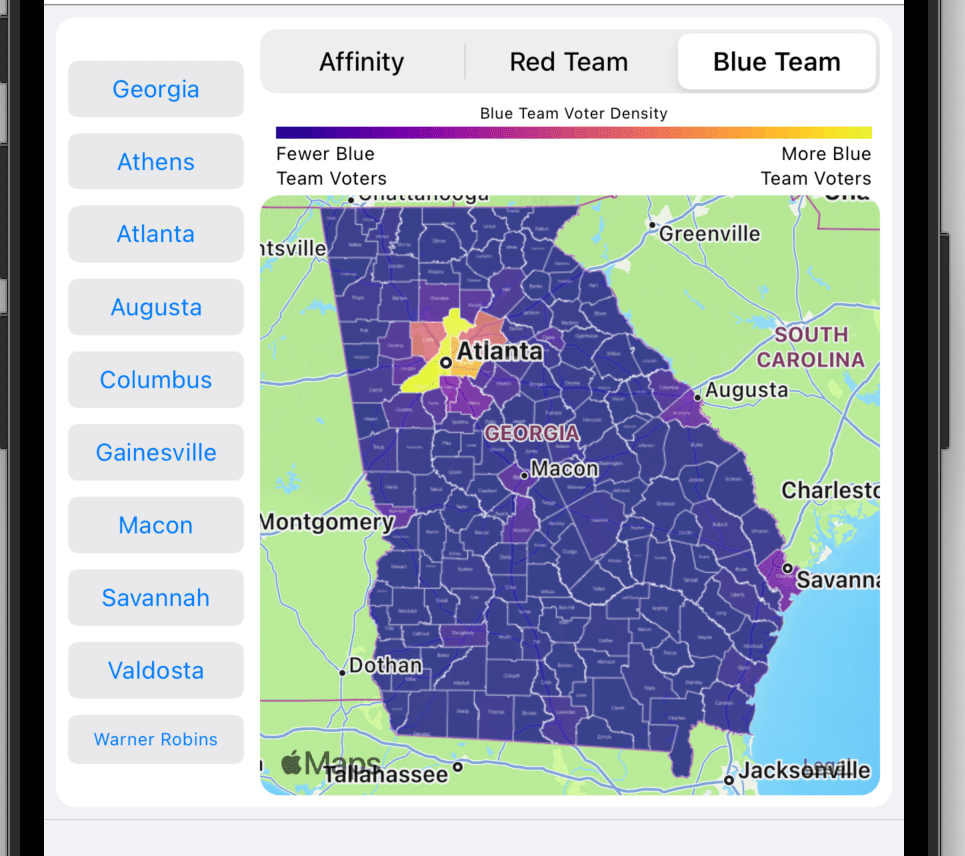 Blue Team: A Blue Team map shows Democratic vote magnitude. The largest number of votes are indicated by a bright yellow color and the least number of votes are indicated by a dark blue color. For example, When looking at the Governor’s contest, Fulton county is a bright yellow. In fact, it is brighter than any other county. This bright color indicates that Fulton delivered the most Democratic votes in the state.