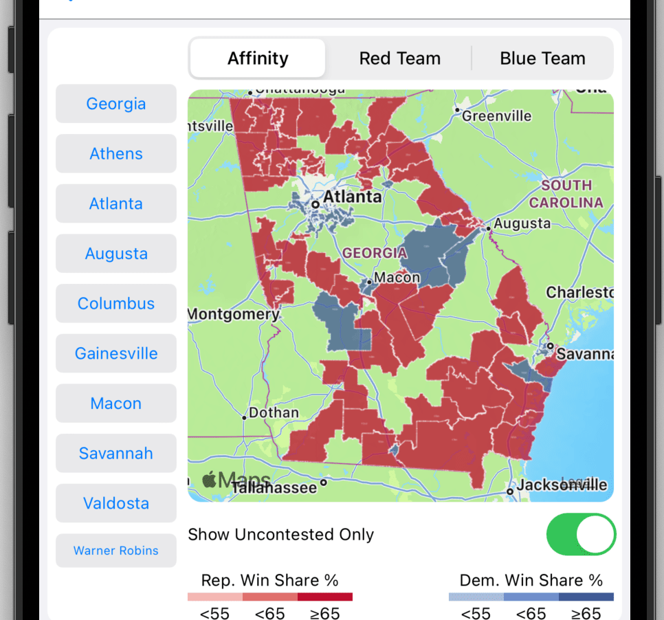 District Map: District maps are used in legislative contests. They show at a district level which party carried the district (Affinity) or which district amassed the most votes for a party (Red or Blue Team). Tap the district to view district specific details. A district affinity map can also show which districts are uncontested. Toggle the Show Uncontested Only to show only uncontested districts.